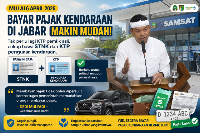 Mulai 6 April 2026, bayar pajak kendaraan di Jabar makin mudah! Tak perlu lagi KTP pemilik asli, cukup STNK dan KTP penguasa kendaraan. Kebijakan ini hadir untuk cegah pungli dan tingkatkan kepatuhan wajib pajak. (Red)