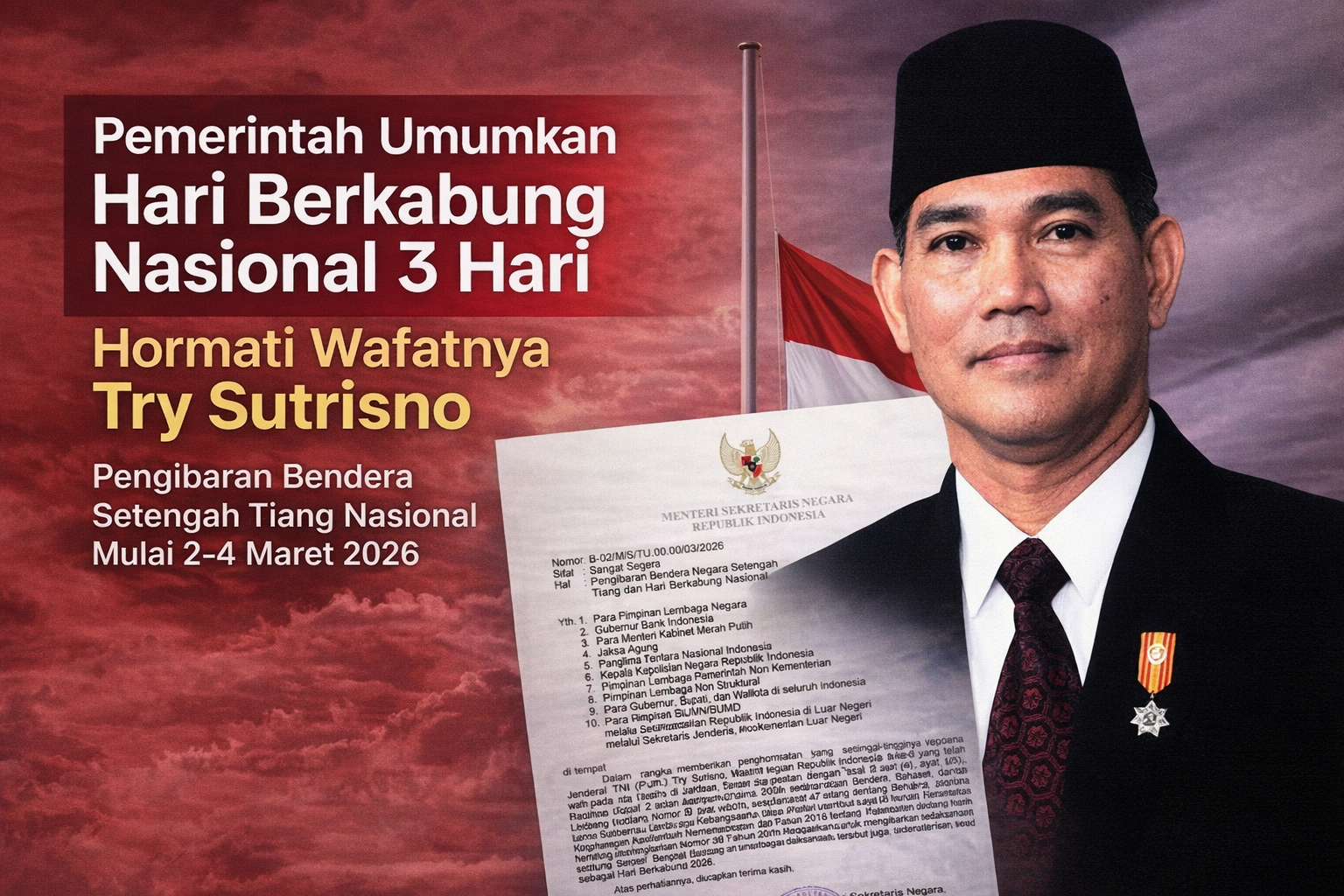 Jakarta, Kantor Berita Jabar – Pemerintah Republik Indonesia secara resmi menetapkan Hari Berkabung Nasional selama tiga hari, terhitung mulai 2 hingga 4 Maret 2026, sebagai bentuk penghormatan negara atas wafatnya , Wakil Presiden Republik Indonesia ke-6.