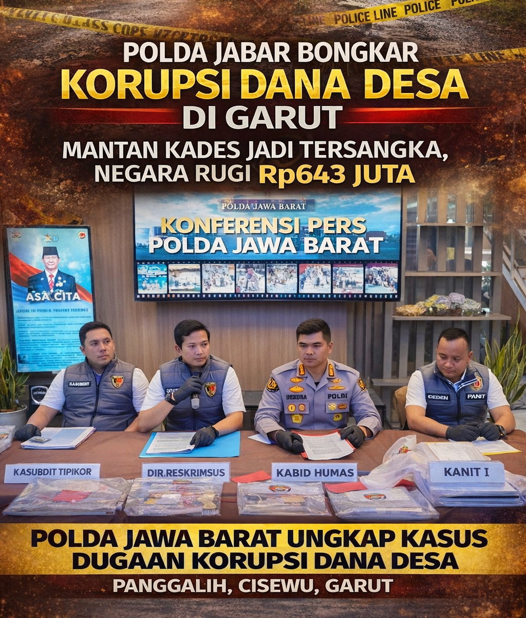 Bandung, Kantor Berita Jabar – Kepolisian Daerah Jawa Barat (Polda Jabar) mengungkap kasus dugaan tindak pidana korupsi Dana Desa di Desa Panggalih, Kecamatan Cisewu, Kabupaten Garut. Dalam perkara ini, seorang mantan kepala desa ditetapkan sebagai tersangka setelah audit menemukan kerugian keuangan negara mencapai Rp643,7 juta.